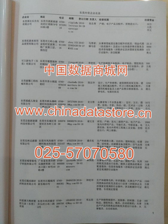 2021版最新東莞企業黃頁包括《東莞制造企業黃頁》、《東莞貿易企業黃頁》、《東莞民營企業黃頁》、《東莞外資企業黃頁》、《東莞外貿企業黃頁》共五冊,現優惠價:280元/冊。每冊內容包括:單位名稱、地址、郵編、電話、傳真、郵箱、經營范圍等;東莞企業黃頁涵蓋了近幾年來最新成立的、有一定規模的企業,具有非常高的營銷價值。有了這套黃頁開展業務也有了針對性,也省去了盲目去尋找客戶名單而浪費的時間了,工作效率也會有很大的提高。歡迎需要東莞企業黃頁的朋友及時聯系我們!