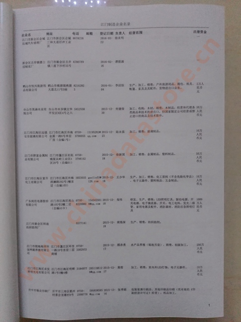 2021版最新江門企業(yè)黃頁(yè)包括《江門制造企業(yè)黃頁(yè)》、《江門貿(mào)易企業(yè)黃頁(yè)》、《江門民營(yíng)企業(yè)黃頁(yè)》、《江門外資企業(yè)黃頁(yè)》、《江門外貿(mào)企業(yè)黃頁(yè)》共五冊(cè),現(xiàn)優(yōu)惠價(jià):280元/冊(cè)。每?jī)?cè)內(nèi)容包括:?jiǎn)挝幻Q、地址、郵編、電話、傳真、郵箱、經(jīng)營(yíng)范圍等;江門企業(yè)黃頁(yè)涵蓋了近幾年來(lái)最新成立的、有一定規(guī)模的企業(yè),具有非常高的營(yíng)銷價(jià)值。有了這套黃頁(yè)開(kāi)展業(yè)務(wù)也有了針對(duì)性,也省去了盲目去尋找客戶名單而浪費(fèi)的時(shí)間了,工作效率也會(huì)有很大的提高。歡迎需要江門企業(yè)黃頁(yè)的朋友及時(shí)聯(lián)系我們!