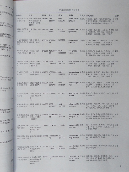2025年新版中國家紡采購企業黃頁,收錄了全國各地經營范圍涉及家紡產品的貿易企業,這些都是頗具實力的家紡產品的中國采購商。黃頁內容包含:企業名稱、地址、電話、傳真、郵箱、經營范圍、省份、注冊資金等信息。該套黃頁包含一個黃頁光碟加一冊紙質書刊,全國價格:1500元,省/直轄市價格:400元元,城市價格:200元,共收錄了全國各地大概4945398(統計日期:2018.1)家。黃頁光碟中是EXCEL格式,信息可任意修改、復制、打印、導出及導入到傳真、郵件群發等軟件中,無任何限制。