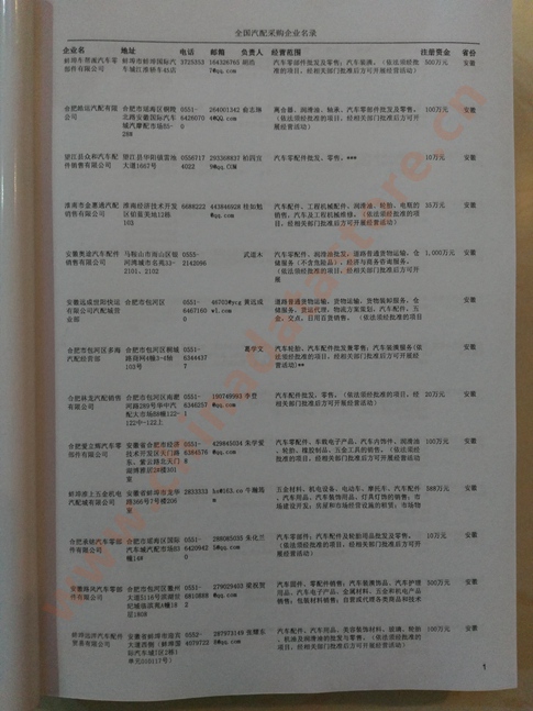 2025年新版中國汽配采購企業(yè)黃頁,收錄了全國各地經(jīng)營范圍涉及汽配產(chǎn)品的貿(mào)易企業(yè),這些都是頗具實力的汽配產(chǎn)品的中國采購商。黃頁內(nèi)容包含:企業(yè)名稱、地址、電話、傳真、郵箱、經(jīng)營范圍、省份、注冊資金等信息。該套黃頁包含一個黃頁光碟加一冊紙質書刊,全國價格:1500元,省/直轄市價格:400元,城市價格:200元,共收錄了全國各地大概8952(統(tǒng)計日期:2018.1)家汽配產(chǎn)品采購企業(yè)。黃頁光碟中是EXCEL格式,信息可任意修改、復制、打印、導出及導入到傳真、郵件群發(fā)等軟件中,無任何限制。