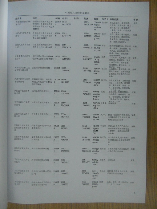 2025年新版中國玩具采購企業黃頁,收錄了全國各地經營范圍涉及玩具產品的貿易企業,這些都是頗具實力的玩具產品的中國采購商。黃頁內容包含:企業名稱、地址、電話、傳真、郵箱、經營范圍、省份、注冊資金等信息。該套黃頁包含一個黃頁光碟加一冊紙質書刊,全國價格:1500元,省/直轄市價格:400元,城市價格:200元,共收錄了全國各地大概1852(統計日期:2018.1)家玩具產品采購企業。黃頁光碟中是EXCEL格式,信息可任意修改、復制、打印、導出及導入到傳真、郵件群發等軟件中,無任何限制。