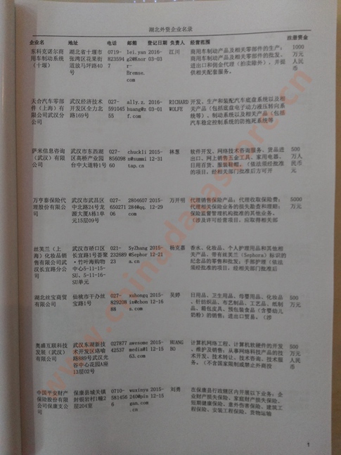 最新湖北外資企業黃頁涵蓋了湖北外商獨資企業、中外合資經營企業以及港、澳、臺資企業,包括湖北臺資日資企業黃頁,湖北外企黃頁具體內容包括:企業名稱、地址、電話、傳真、郵箱、經營范圍、注冊資金等信息;湖北外資企業名單里面的企業都一些中外合資的大企業,這些公司經濟實力都比較雄厚,出口產品也比較多,業務范圍都比較廣,跟他們開展業務往來都比較容易;有了湖北臺企日企黃頁開展業務也有了針對性,也省去了盲目去尋找客戶名單而浪費的時間了,工作效率也會有很大的提高.歡迎需要的客戶及時聯系我們!