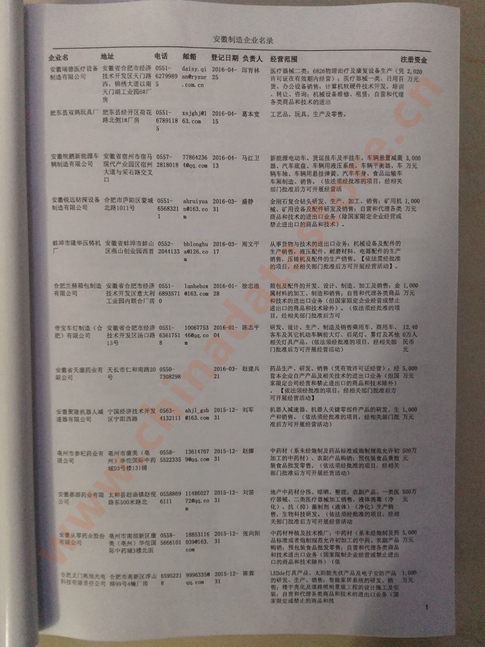 2021版最新安徽企業黃頁包括《安徽制造企業黃頁》、《安徽貿易企業黃頁》、《安徽民營企業黃頁》共三冊,優惠價:280元/冊。每冊內容包括:單位名稱、地址、郵編、電話、傳真、郵箱、經營范圍等;安徽企業黃頁涵蓋了近幾年來最新成立的、有一定規模的企業,具有非常高的營銷價值。有了這套黃頁開展業務也有了針對性,也省去了盲目去尋找客戶名單而浪費的時間了,工作效率也會有很大的提高。歡迎需要安徽企業黃頁的朋友及時聯系我們!