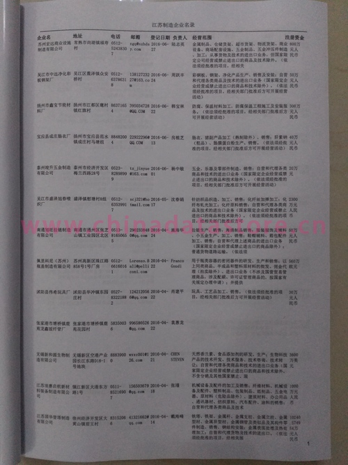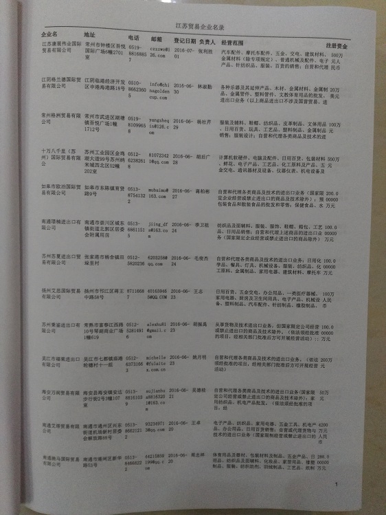 2021版最新江蘇企業(yè)黃頁(yè)包括《江蘇制造企業(yè)黃頁(yè)》、《江蘇貿(mào)易企業(yè)黃頁(yè)》、《江蘇民營(yíng)企業(yè)黃頁(yè)》共三冊(cè),優(yōu)惠價(jià):280元/冊(cè)。每?jī)?cè)內(nèi)容包括:?jiǎn)挝幻Q、地址、郵編、電話、傳真、郵箱、經(jīng)營(yíng)范圍等;江蘇企業(yè)黃頁(yè)涵蓋了近幾年來(lái)最新成立的、有一定規(guī)模的企業(yè),具有非常高的營(yíng)銷價(jià)值。有了這套黃頁(yè)開展業(yè)務(wù)也有了針對(duì)性,也省去了盲目去尋找客戶名單而浪費(fèi)的時(shí)間了,工作效率也會(huì)有很大的提高。歡迎需要江蘇企業(yè)黃頁(yè)的朋友及時(shí)聯(lián)系我們!