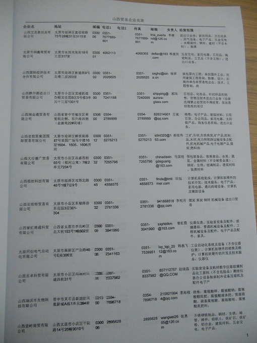 2021版最新山西企業(yè)黃頁包括《山西制造企業(yè)黃頁》、《山西貿易企業(yè)黃頁》、《山西民營企業(yè)黃頁》共三冊,優(yōu)惠價:280元/冊。每冊內容包括:單位名稱、地址、郵編、電話、傳真、郵箱、經營范圍等;山西企業(yè)黃頁涵蓋了近幾年來最新成立的、有一定規(guī)模的企業(yè),具有非常高的營銷價值。有了這套黃頁開展業(yè)務也有了針對性,也省去了盲目去尋找客戶名單而浪費的時間了,工作效率也會有很大的提高。歡迎需要山西企業(yè)黃頁的朋友及時聯(lián)系我們!