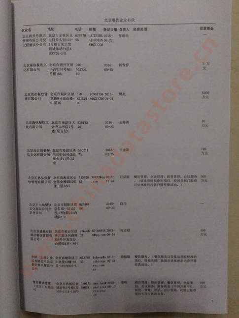 最新北京餐飲企業黃頁數據更新日期2025年12月最新,都是具有一定規模的北京餐飲行業的注冊實體企業,數據準確率高,是您開展各項營銷活動的必備資料。企業名單包括:企業名稱、地址、電話(以上必有,以下選有)、傳真、郵箱、登記日期、經營范圍、注冊資金等信息。北京餐飲企業黃頁數據為Excel格式,信息可任意修改、復制、打印、導出及導入到傳真、郵件群發等軟件中,無任何限制。
