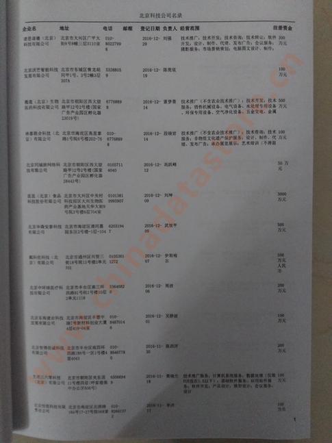 最新北京科技生產與貿易企業黃頁數據更新日期2025年12月最新,全國北京科技企業黃頁,都是具有一定規模的北京科技行業的注冊實體企業,數據準確率高,是您開展各項營銷活動的必備資料。企業名單包括:企業名稱、地址、電話(以上必有,以下選有)、傳真、郵箱、登記日期、經營范圍、注冊資金等信息。北京科技企業黃頁數據為Excel格式,信息可任意修改、復制、打印、導出及導入到傳真、郵件群發等軟件中,無任何限制。