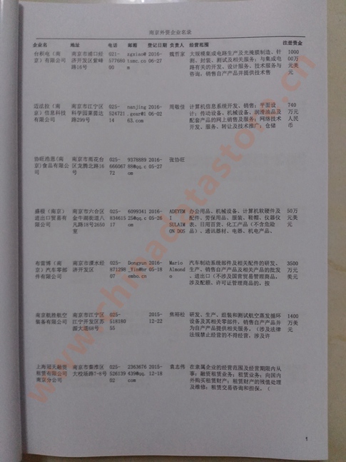 南京外貿企業黃頁包括:外貿企業名稱、地址、電話、傳真、郵箱、經營范圍、注冊資金等信息。