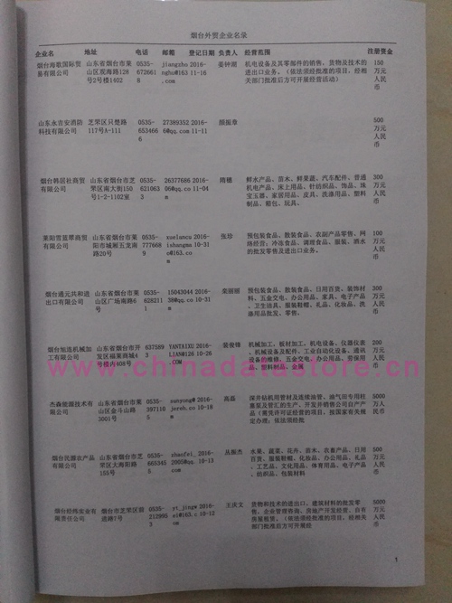 煙臺外貿企業黃頁包括:外貿企業名稱、地址、電話、傳真、郵箱、經營范圍、注冊資金等信息。