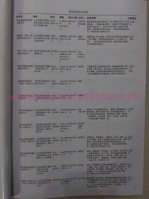 最新青島外資企業黃頁涵蓋了青島外商獨資企業、中外合資經營企業以及港、澳、臺資企業,包括青島臺資日資企業黃頁,青島外企黃頁具體內容包括:企業名稱、地址、電話、傳真、郵箱、經營范圍、注冊資金等信息;青島外企黃頁里面的企業都一些中外合資的大企業,這些公司經濟實力都比較雄厚,出口產品也比較多,業務范圍都比較廣,跟他們開展業務往來都比較容易;有了青島日企臺企黃頁開展業務也有了針對性,也省去了盲目去尋找客戶名單而浪費的時間了,工作效率也會有很大的提高.歡迎需要青島外資公司黃頁的客戶及時聯系我們!